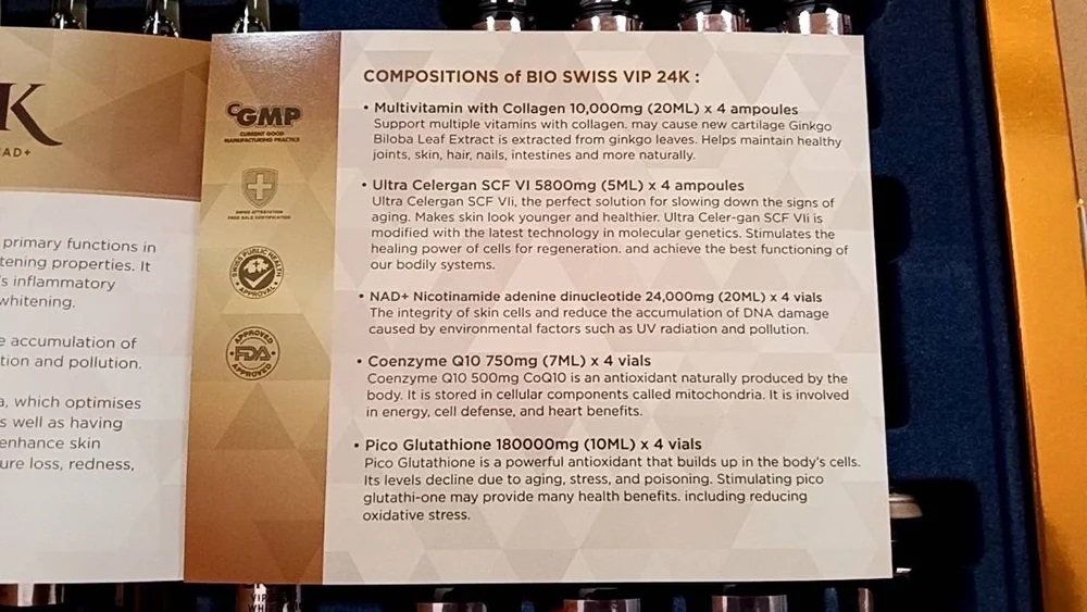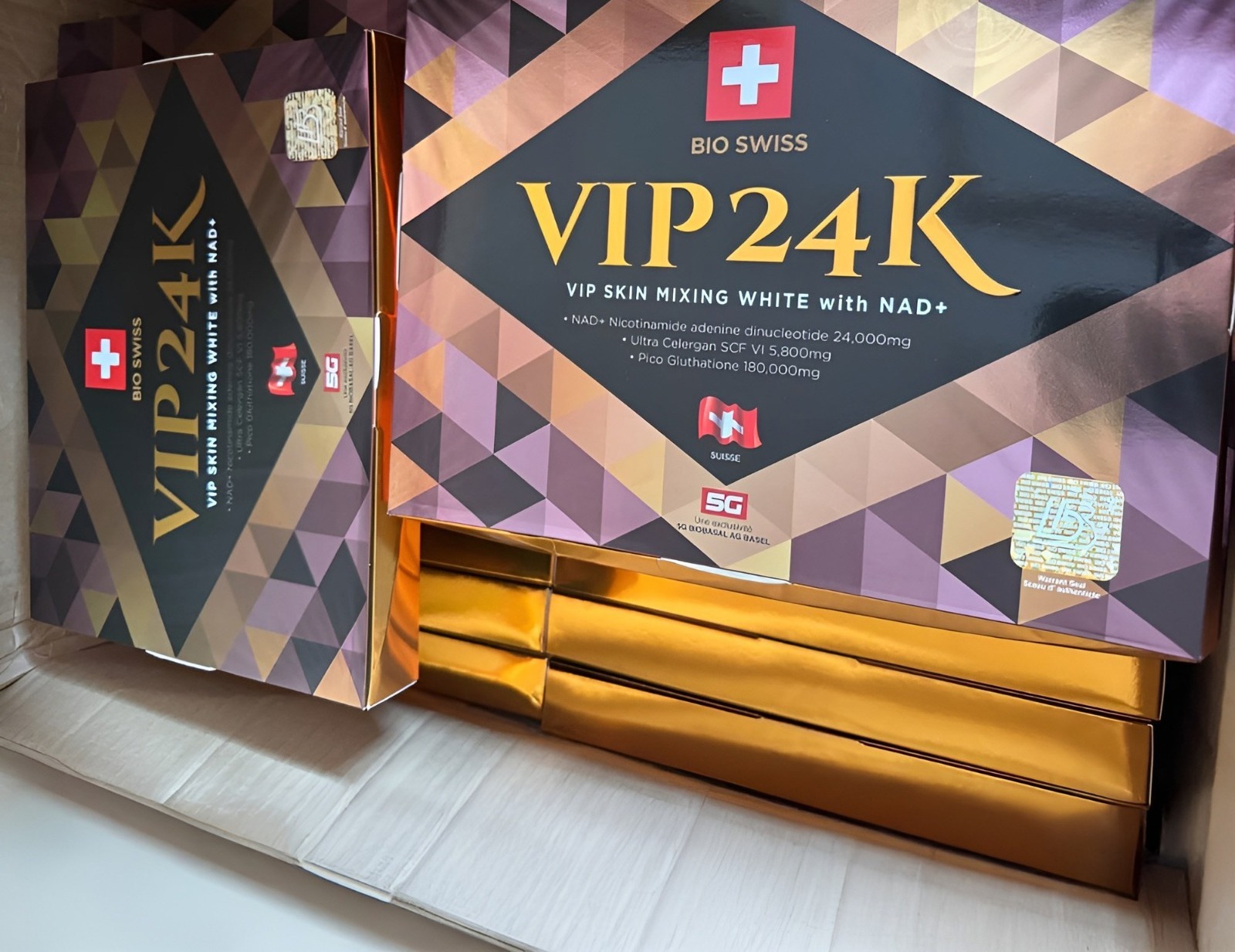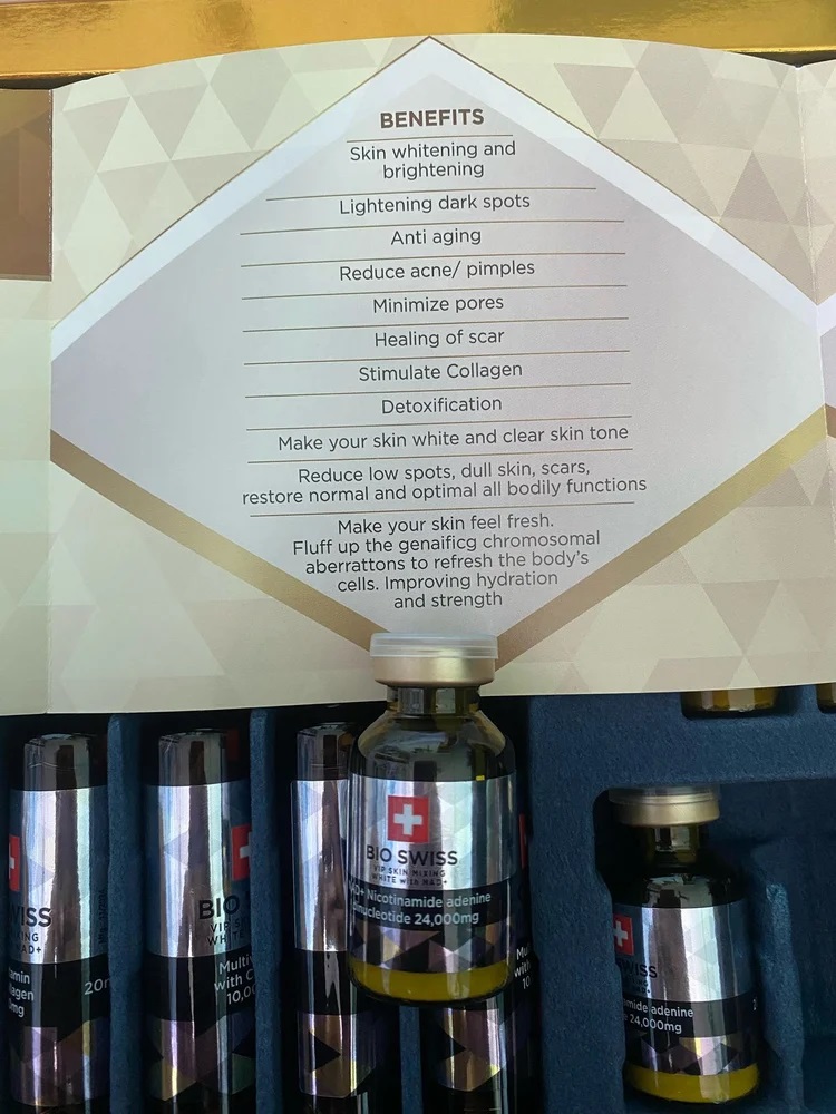 Bio Swiss VIP 24K is a premium skin-enhancing formulation designed to support skin rejuvenation, brightening, and overall vitality. It combines advanced ingredients such as NAD+, glutathione, collagen, and antioxidants to help improve skin health and reduce visible signs of aging.