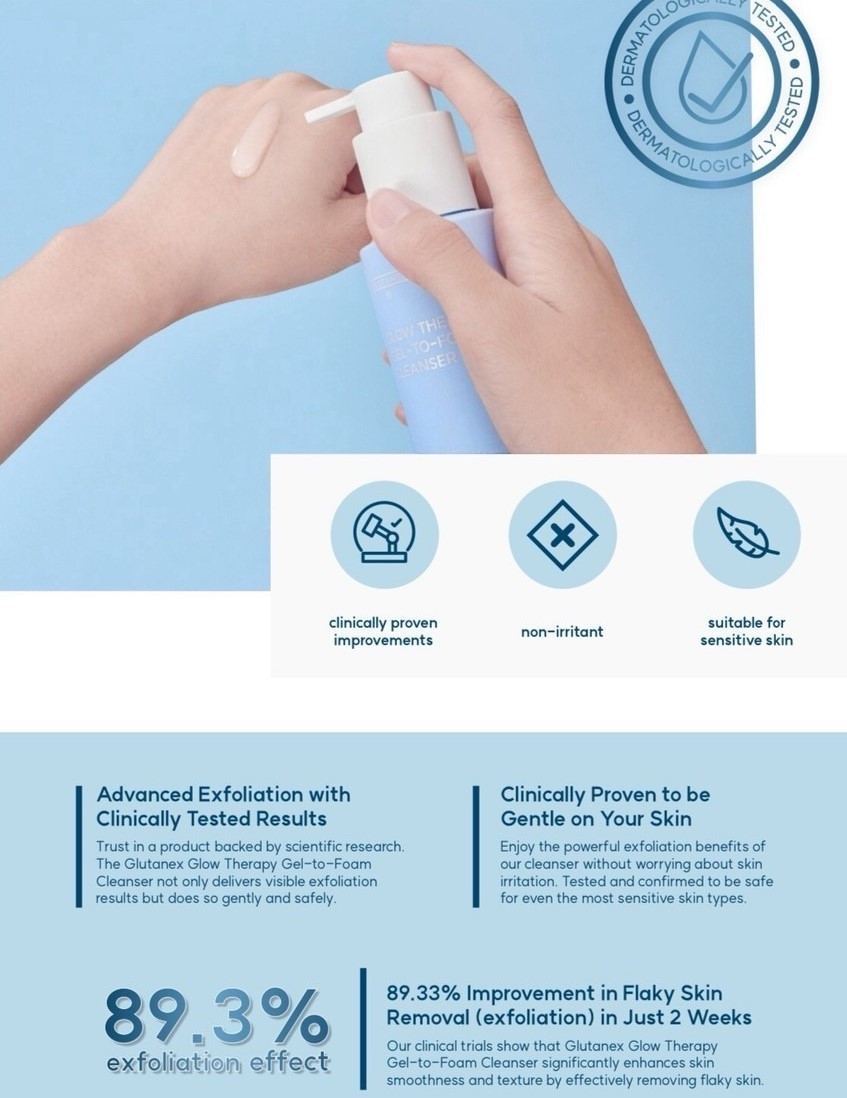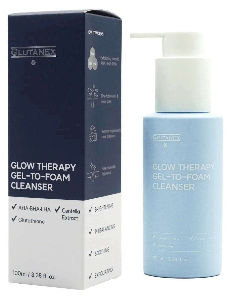 The Glutanex Glow Therapy Gel-To-Foam Cleanser is an advanced exfoliating facial cleanser designed to deeply cleanse pores, gently remove dead skin cells, and improve overall skin brightness. Its innovative gel-to-foam formula transforms into a rich micro-foam upon contact with water, allowing it to penetrate pores and effectively remove dirt, excess oil, and impurities while maintaining the skin’s natural moisture balance.
